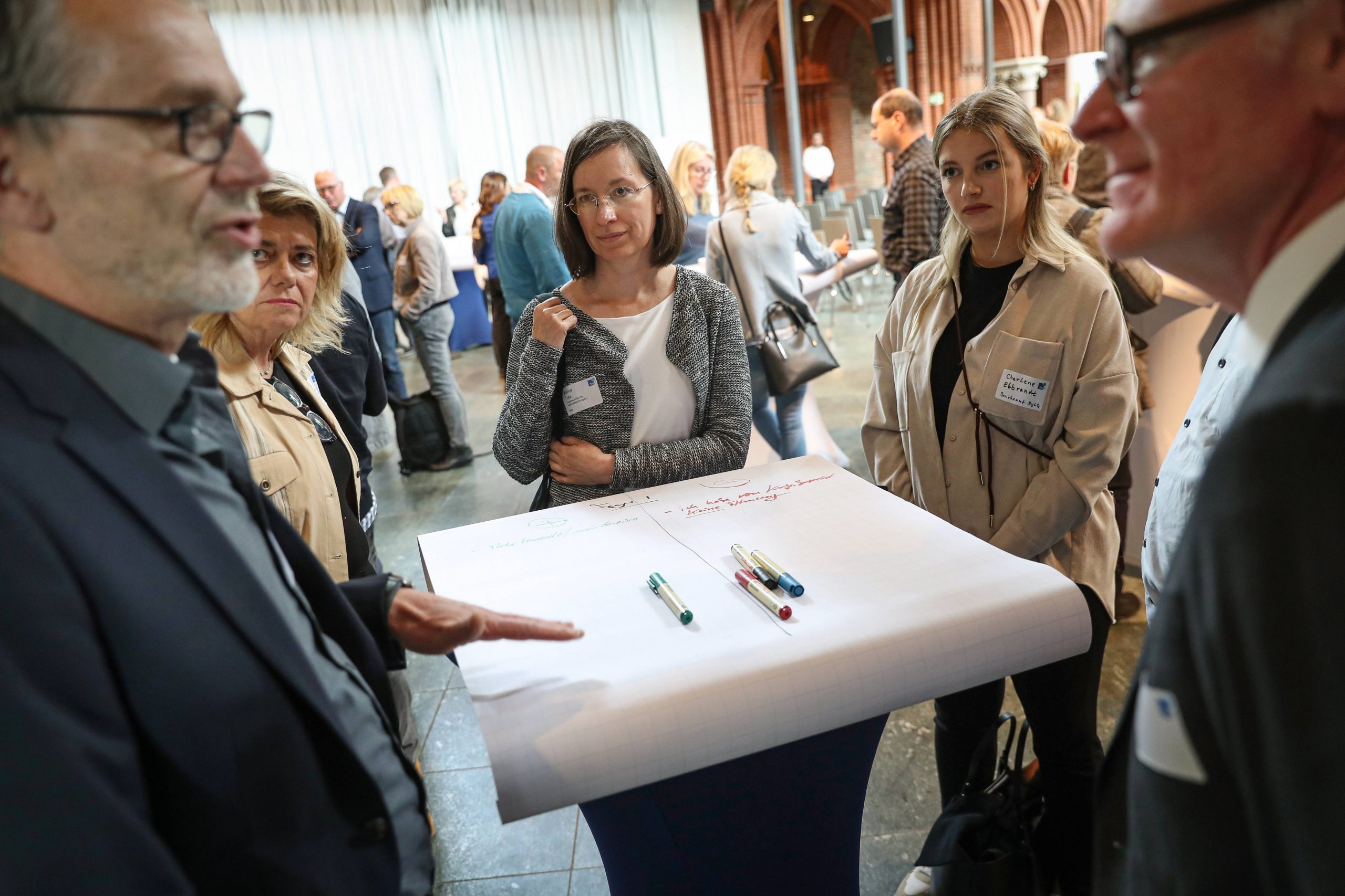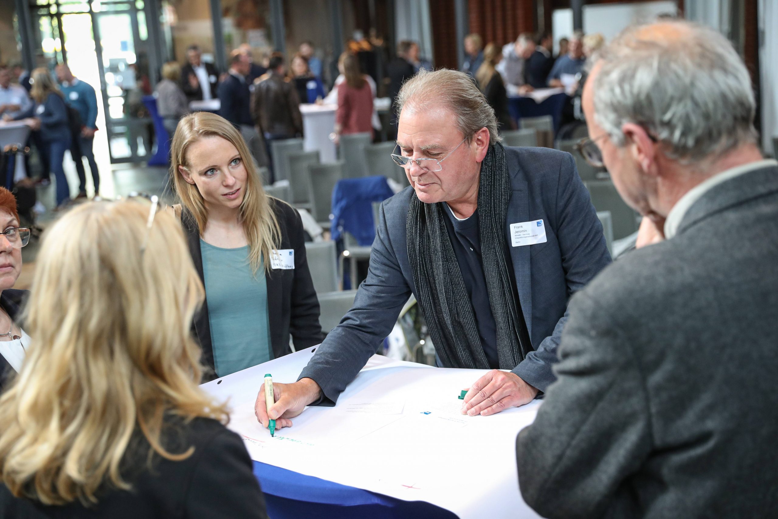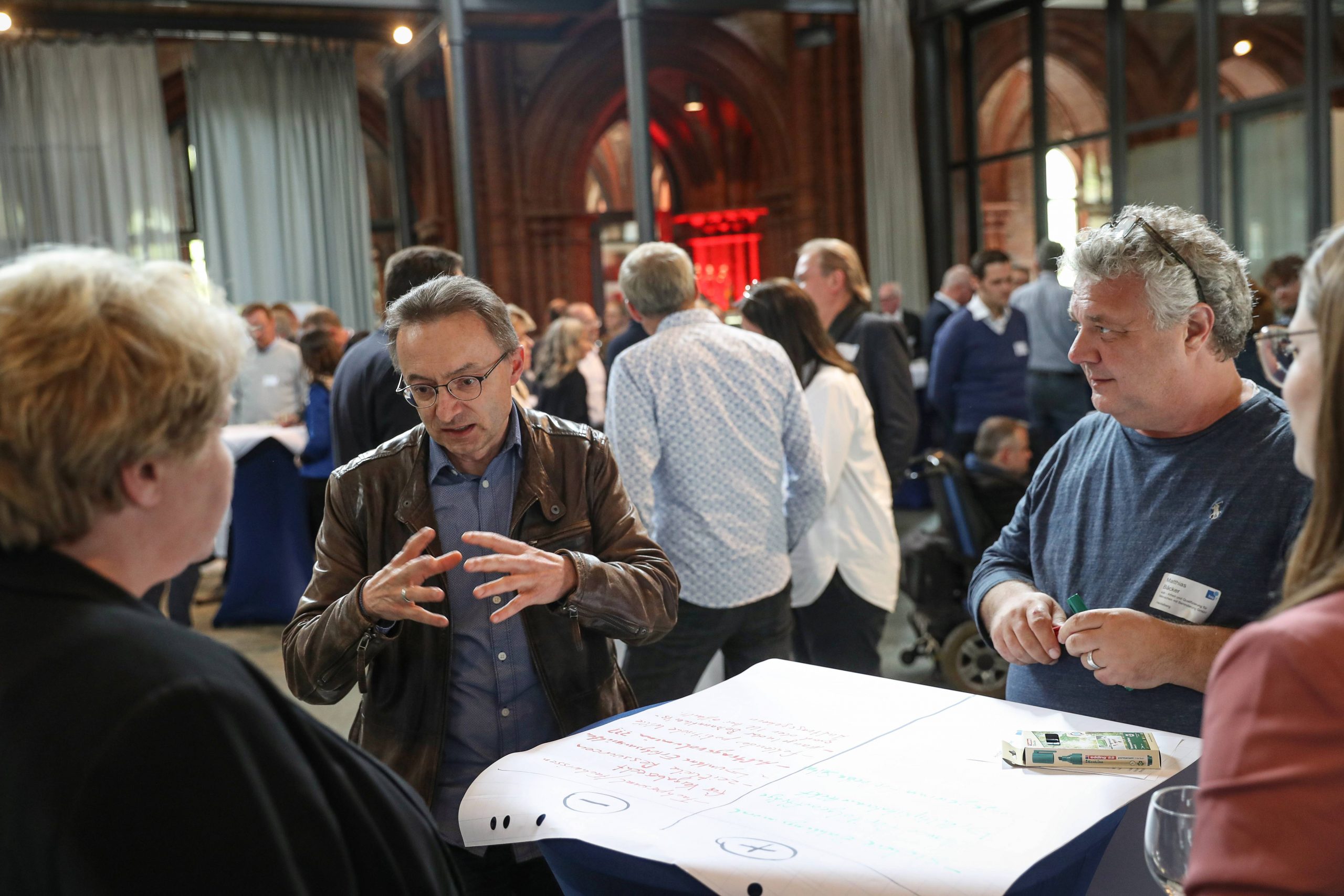 An die Impulsreferate schloss das interaktive World Café an. Eine Methode, die dazu einlädt, Wissen und Erfahrungen zu teilen, gemeinsam Lösungen zu entwickeln und – ganz nebenbei – Netzwerke aufzubauen. Die Teilnehmenden tauschten sich über Hürden und Chancen der öffentlichen Auftragsvergabe aus. Sie diskutierten, was Inklusionsunternehmen konkret tun können, um öffentliche Aufträge zu erhalten und mit welchen Argumenten sie öffentliche Auftraggeber überzeugen. Auch die Impulsgeber*innen beteiligten sich an dem Format und brachten ihr Expertenwissen ein.